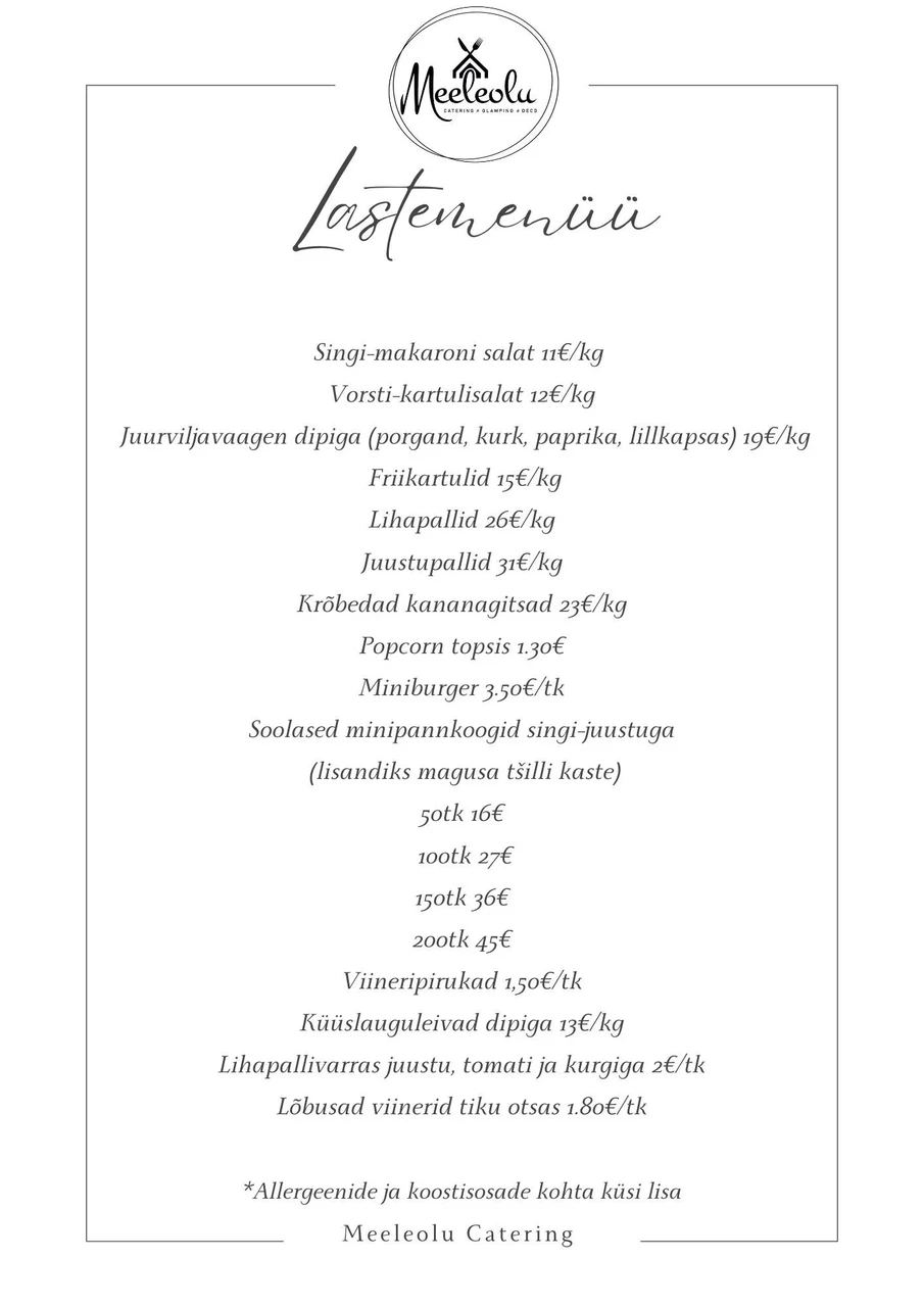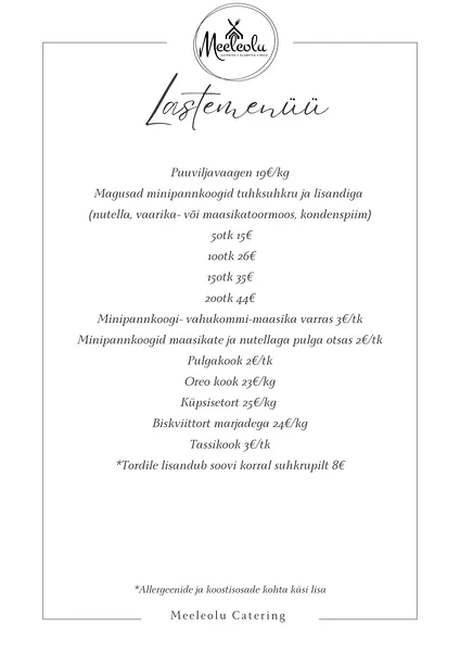 Teeme koostööd Meeleolu Cateringiga. Nad toovad teie tellitud toidu kohale tasuta juba 40€ ostust olenemata kellaajast. Menüü on väga mitmekesine ning igaüks leiab endale meelepärase valiku.
